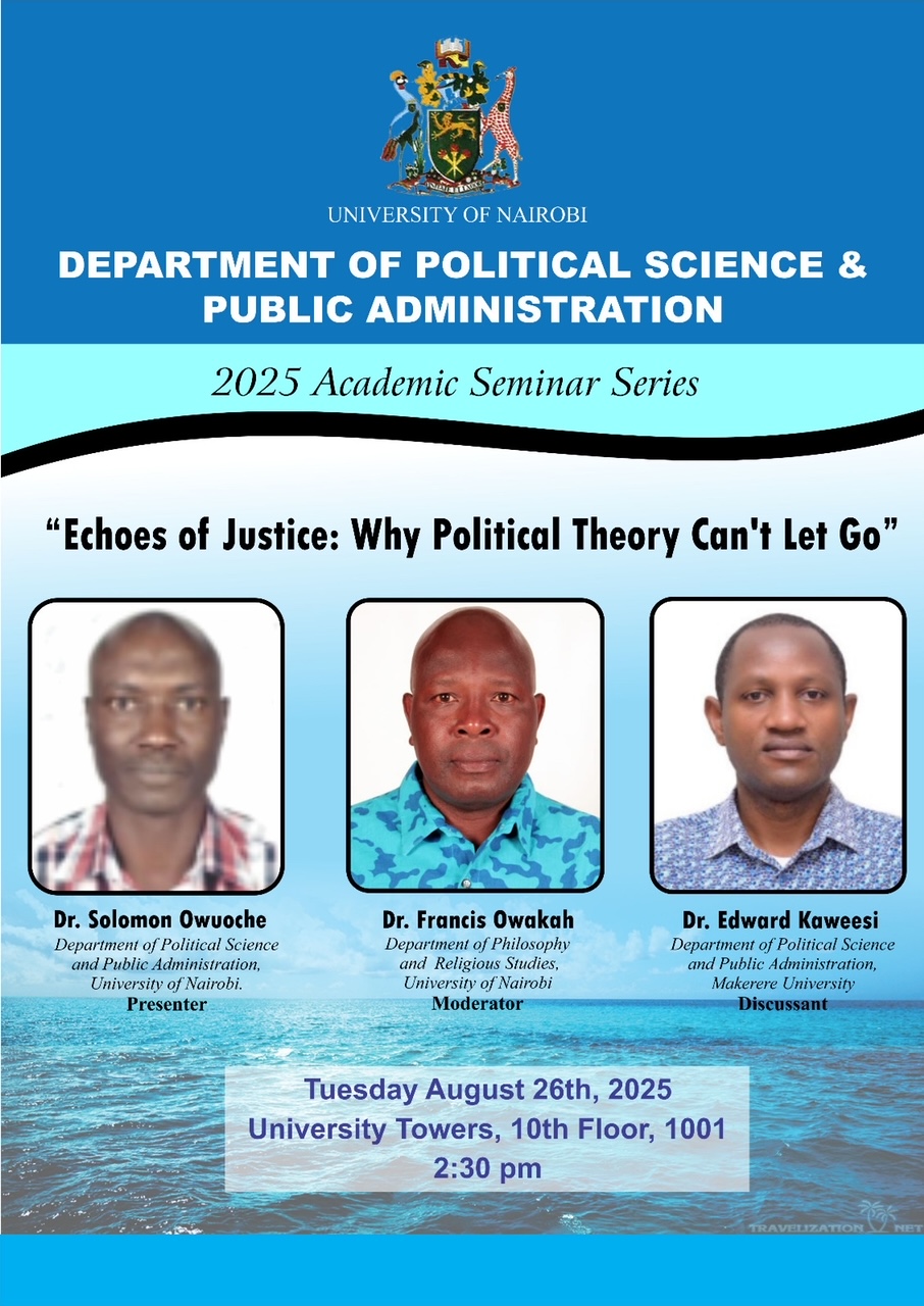 On 26 August 2025, the Department held its Academic Seminar Series titled: "Echoes of Justice: Why Political Theory Can't Let Go". The main presenter at this Seminar Series was Dr. Solomon Owuoche, Senior Lecturer, Department of Political Science and Public Administration, University of Nairobi.