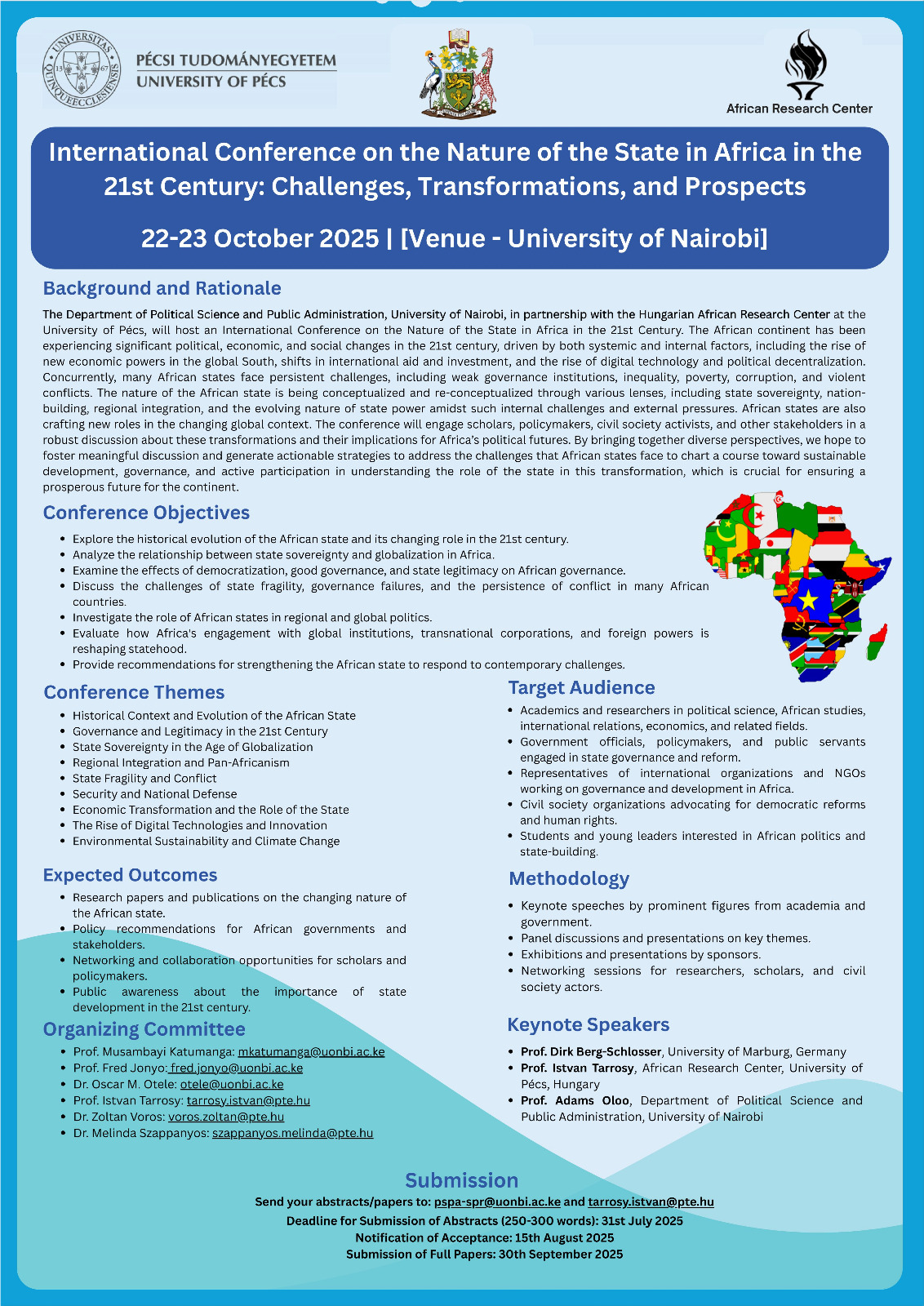 The Department of Political Science and Public Administration, University of Nairobi, in partnership with the Hungarian African Research Centre at the University of Pecs, will host an International Conference on the Nature of the State in Africa in the 21st Century. Details of the conference are posted here in.